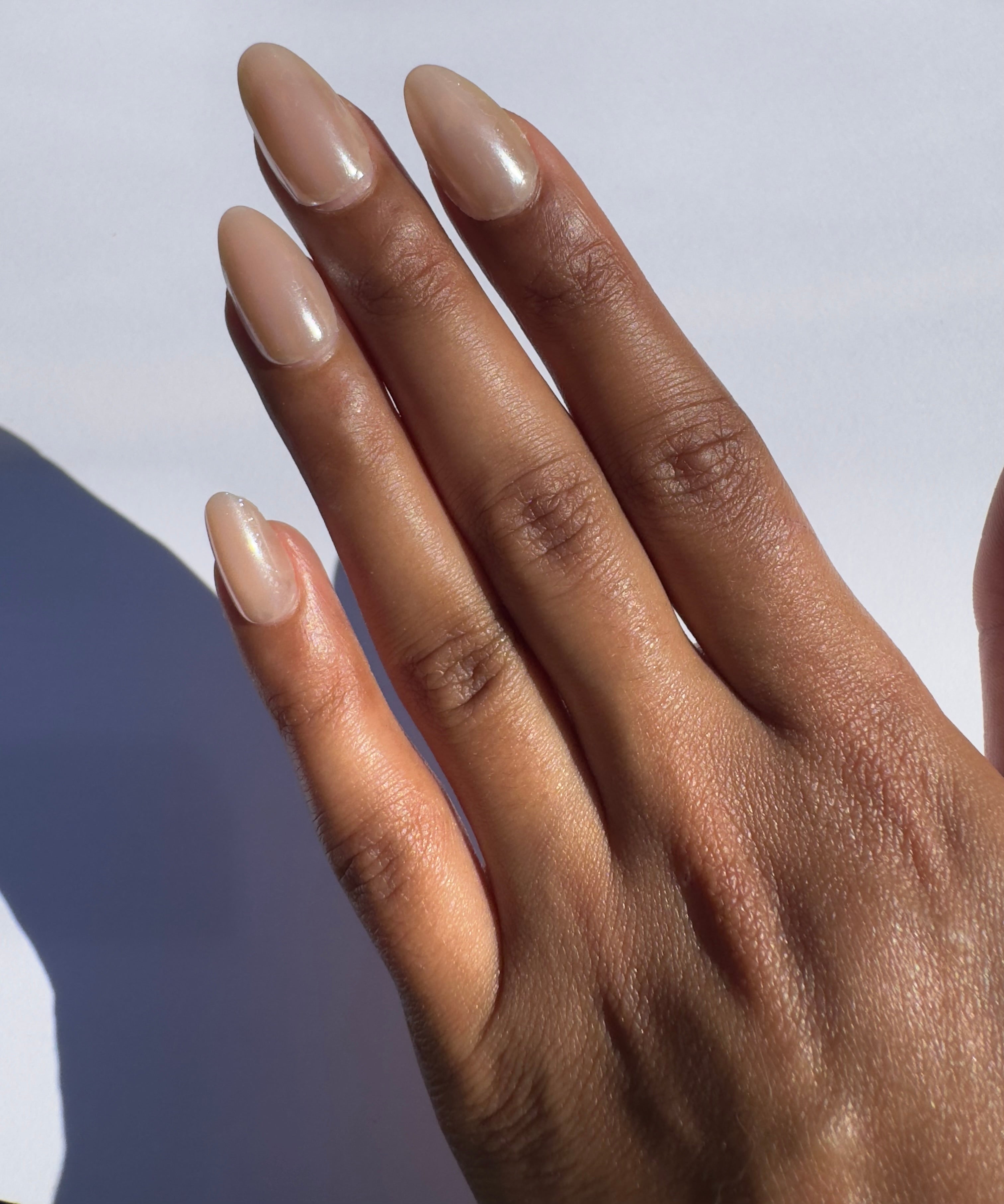 Experience our light pink nails with chrome shimmer, designed to match any outfit. This luminous set will give you a feminine and sleek finish effortlessly.